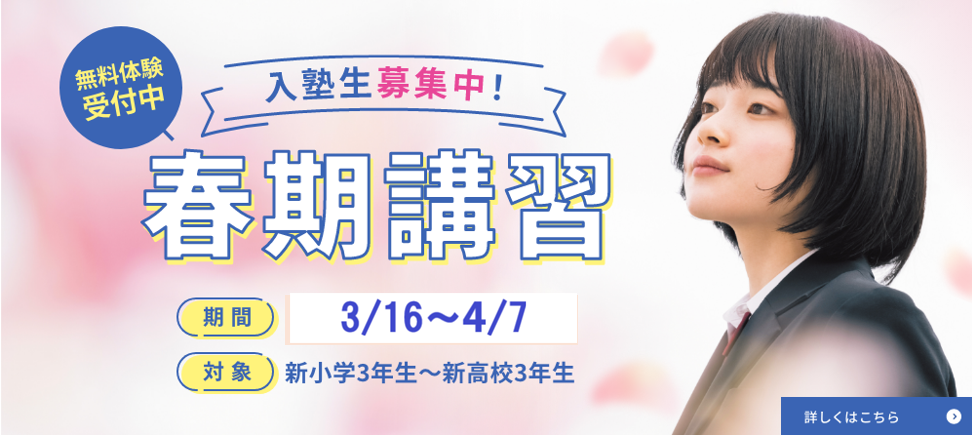 神戸・明石中心の小・中・高生が対象一人ひとりに合わせたオーダーメイドカリキュラムの進学個別指導塾 ニュース&トピックス 一覧へ 2026.02.02 イベント・講習・キャンペーン 春期講習生募集開始! NEW イベント・講習・キャンペーン 2026.01.15 イベント・講習・キャンペーン 冬期講習やり切りました! イベント・講習・キャンペーン 2025.12.15 イベント・講習・キャンペーン 冬期講習、始まってます。 イベント・講習・キャンペーン 各教室の取り組み 一覧へ 2026.01.29 鈴蘭台教室 冬期講習後アンケート結果 NEW 鈴蘭台教室 2026.01.18 垂水教室 大学受験に向けて 垂水教室 2026.01.12 西神中央教室 受験直前!親がやっていいこと・ダメなこと 西神中央教室 2026.01.04 兵庫中央教室 受験のスケジュール感 兵庫中央教室 教室を探す 教室一覧からお近くの 教室をお探しいただけます。 教室一覧はこちら 入塾の流れ 合格者の声